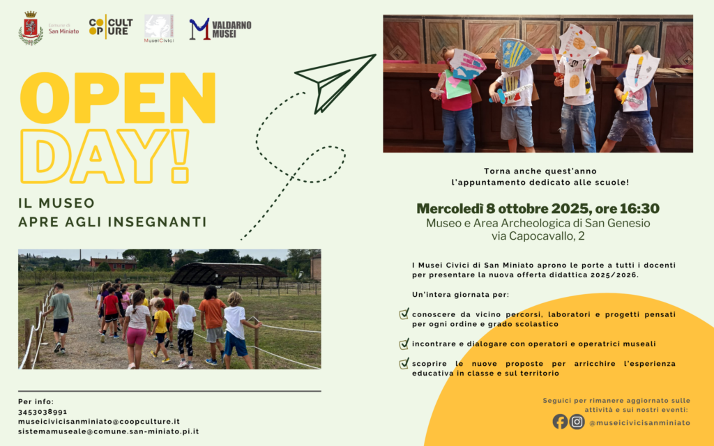 I Musei Civici di San Miniato invitano tutti i docenti a partecipare all’Open Day dedicato alle scuole, in programma mercoledì 8 ottobre 2025 alle ore 16:30 presso il Museo e l’Area Archeologica di San Genesio (via Capocavallo, 2).